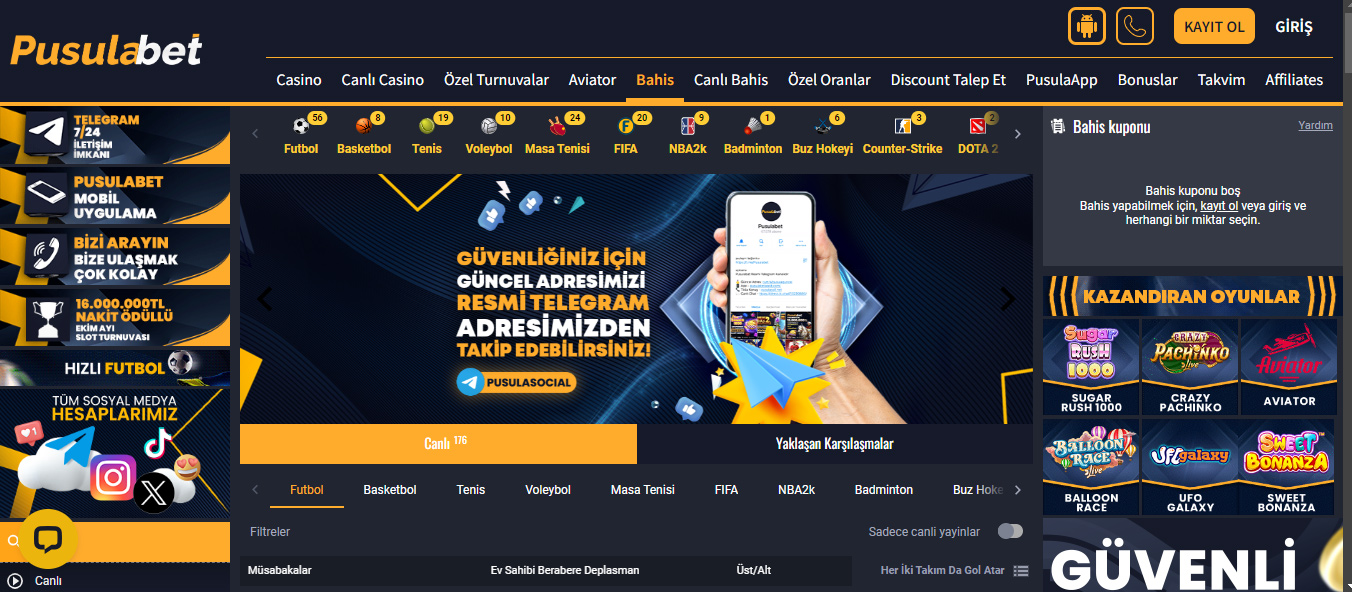 Pusulabet, futbol, basketbol, tenis gibi birçok spor dalında bahis imkanı sunmasının yanı sıra, canlı bahis seçenekleri ile kullanıcılarına gerçek zamanlı bahis yapma fırsatı sunmaktadır. Bu yönüyle, Pusulabet Bahis Sitesi, bahis tutkunları için vazgeçilmez bir tercih haline gelmiştir.